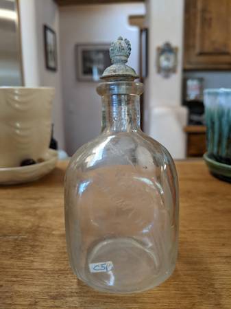 Condition: both very good for age. the glass has the expected bubbles intrinsic to manufacture; there is wear & 1 internal crack as well as a few dings. The stopper has some erosion/oxidation to the metal and is missing a bit of cork.