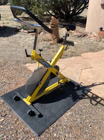 LeMond Revmaster indoor exercise bike. No electronics to fail, no subscription required. Just solid steel and heavy duty professional grade bike from a commercial gym. Heavy duty steel flywheel for a smooth ride. This is the one you will ride and not use as a clothes rack! With a heavy rubber floor mat.