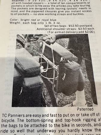 For your consideration is a set of used Touring Cyclist TC Panniers. Introduced in the mid 1970’s, they were considered the gold standard for bicycle panniers. Extremely well made and intelligently designed and crafted, they are highly functional as well as aesthetically attractive.