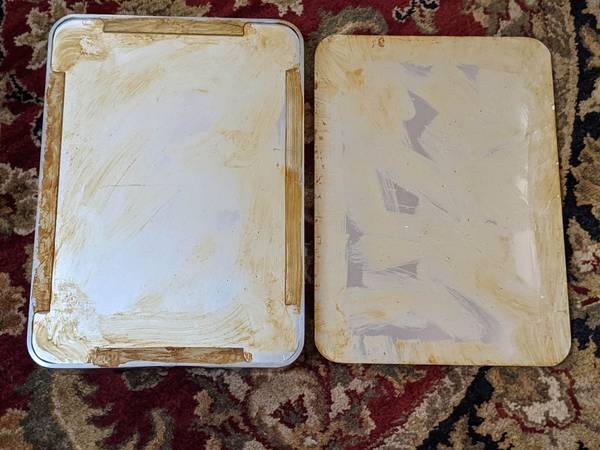 Lid to paper tray: slightly smaller than the tray & acts as a weight 13" x 9" x 1/2" tall at handle. In very good condition